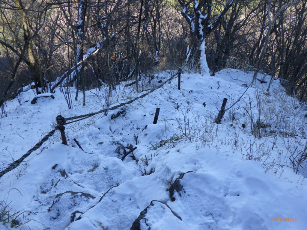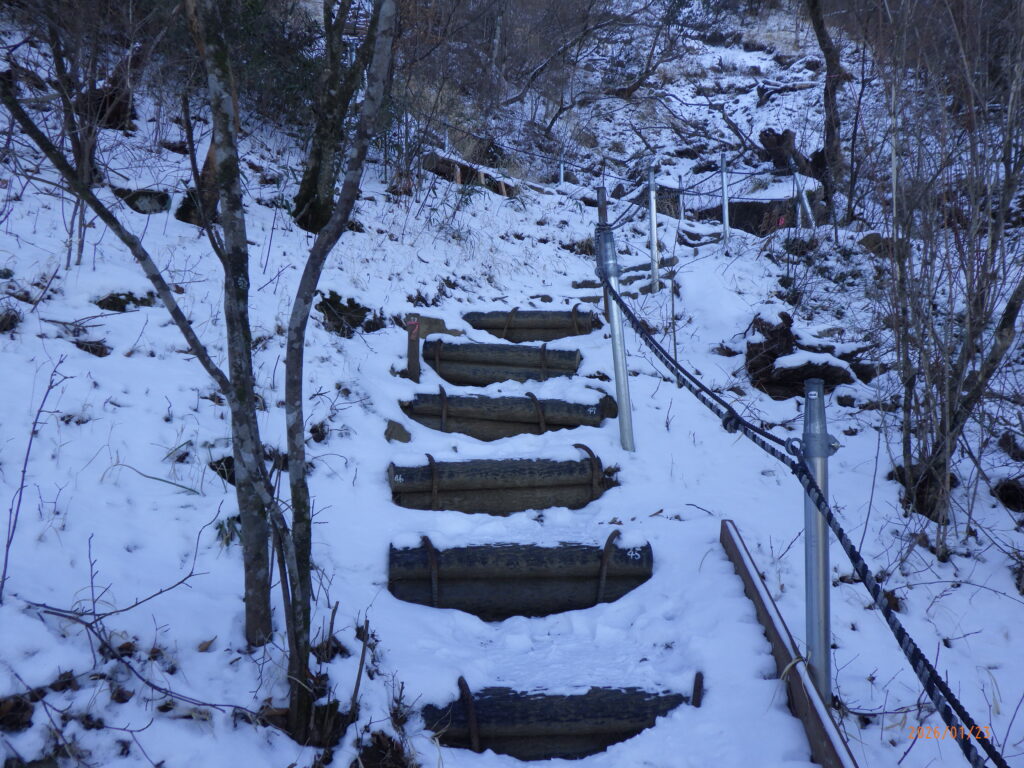 金時山でも積雪となっています。ゲートから登り口までは、融雪が始まり土が見えたりし始めていますが、階段部分は北面となり雪が残っています。ハイカーの踏み後箇所が溶けて凍結する恐れがありますので、お守りとしてチェーンスパイク等のご持参をお願い致します。